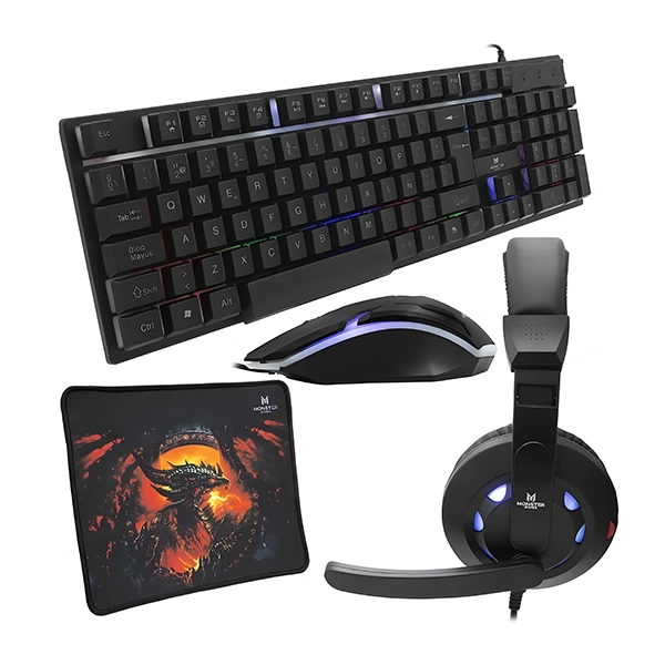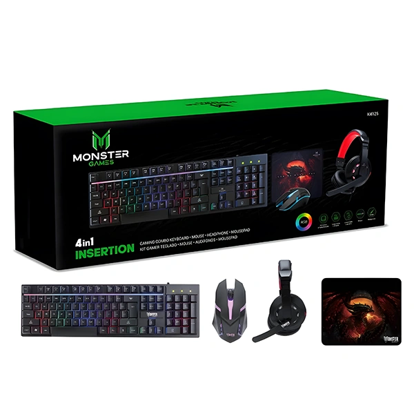 Kit 4 En 1 Monster Insertion K4125, Mouse + Teclado (Es) + PadMouse + Audífonos